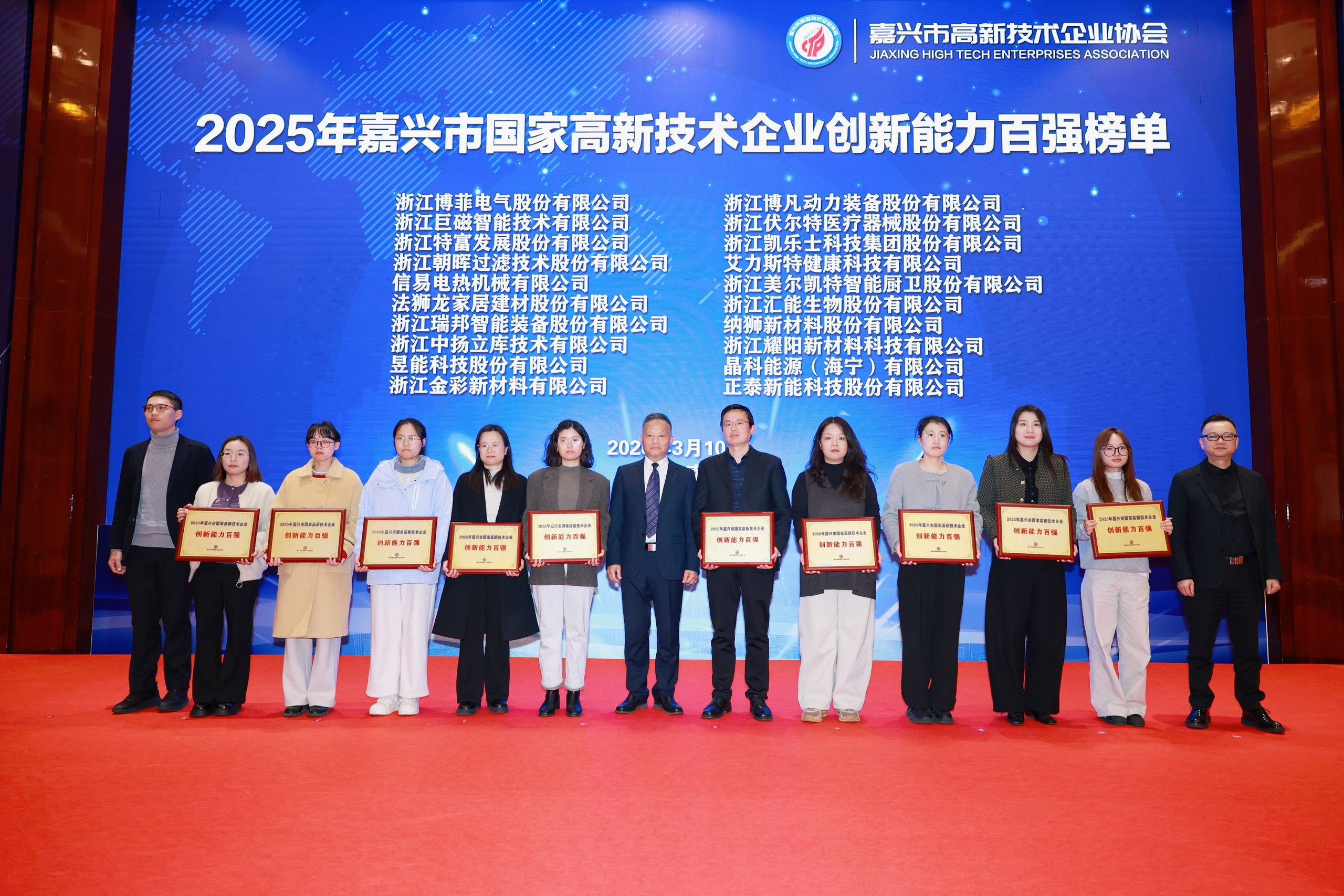 大会重磅发布2025年嘉兴市国家高新技术企业创新能力百强榜单及电子信息、生物与新医药等五大领域高成长十强榜单。巨石集团有限公司等100家企业入选创新能力百强,安费诺嘉力讯(海盐)连接技术有限公司等50家企业分获五个领域高成长十强。市领导、市有关部门领导、省和市高企协会负责人为上榜企业代表授牌,表彰其在科技创新中的标杆引领作用。